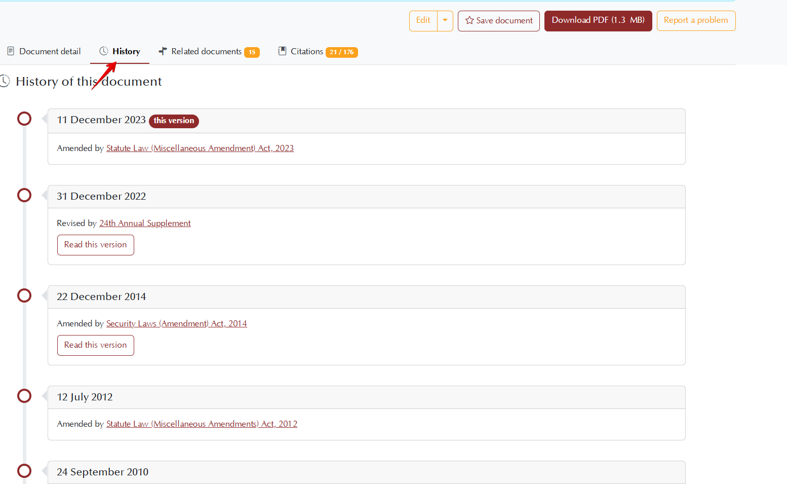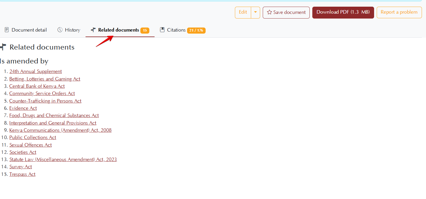 3. Click on the **Related documents** tab to view a list of statutes that the current document amends, repeals, or is amended by. This section also provides details on the amending legislation and statutory instruments associated with the document.